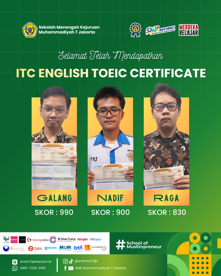 Selamat kepada peserta didik kelas XII SMK Muhammadiyah 7 Jakarta yang telah berhasil mendapatkan Sertifikat TOEIC. Semoga bermanfaat dan menjadi bekal di masa depan 🫶
